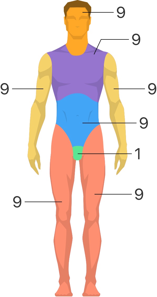中国九分法:根据实际测量结果,按解剖部位将人体以"九"为单位估计烧伤面积,即头颈一个"九",双上肢两个"九",躯干三个"九",双下肢(包括臀部)五个"九"再加"一"。儿童则因头部面积相对较大,双下肢相对较小,随年龄而变,以12岁作为年龄分界线,在计算面积时,相应加减年龄因素。